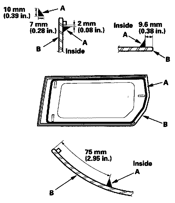 15. Put the cartridge in a caulking gun, and run a bead of adhesive (A) around the edge of the glass (B) as shown. Apply the adhesive within 30 minutes after applying the glass primer. Make a slightly thicker bead at each corner.