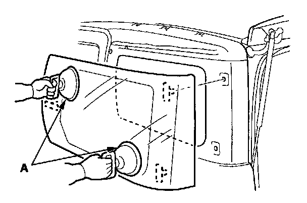 16. Use suction cups (A) to hold the quarter glass over the opening, align it and set it down on the adhesive. Lightly push on the quarter glass until its edges are fully seated on the adhesive all the way around.