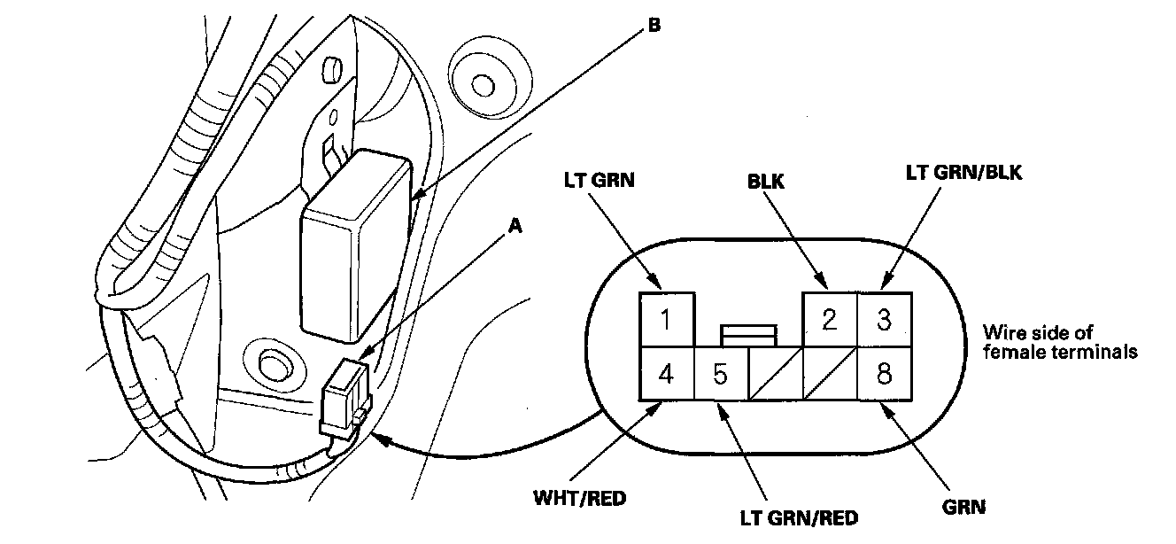2. Disconnect the 8P connector (A) from the rear window wiper control unit (B).