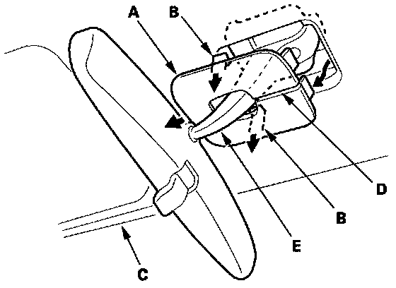 1. Using the appropriate tool from the KTC trim tool set, carefully remove the headliner cap (A) by releasing the hooks (B) from the headliner (C), and remove the cap through the slit (D) on it from the rearview mirror stay (E). Take care not to scratch the cap and headliner.