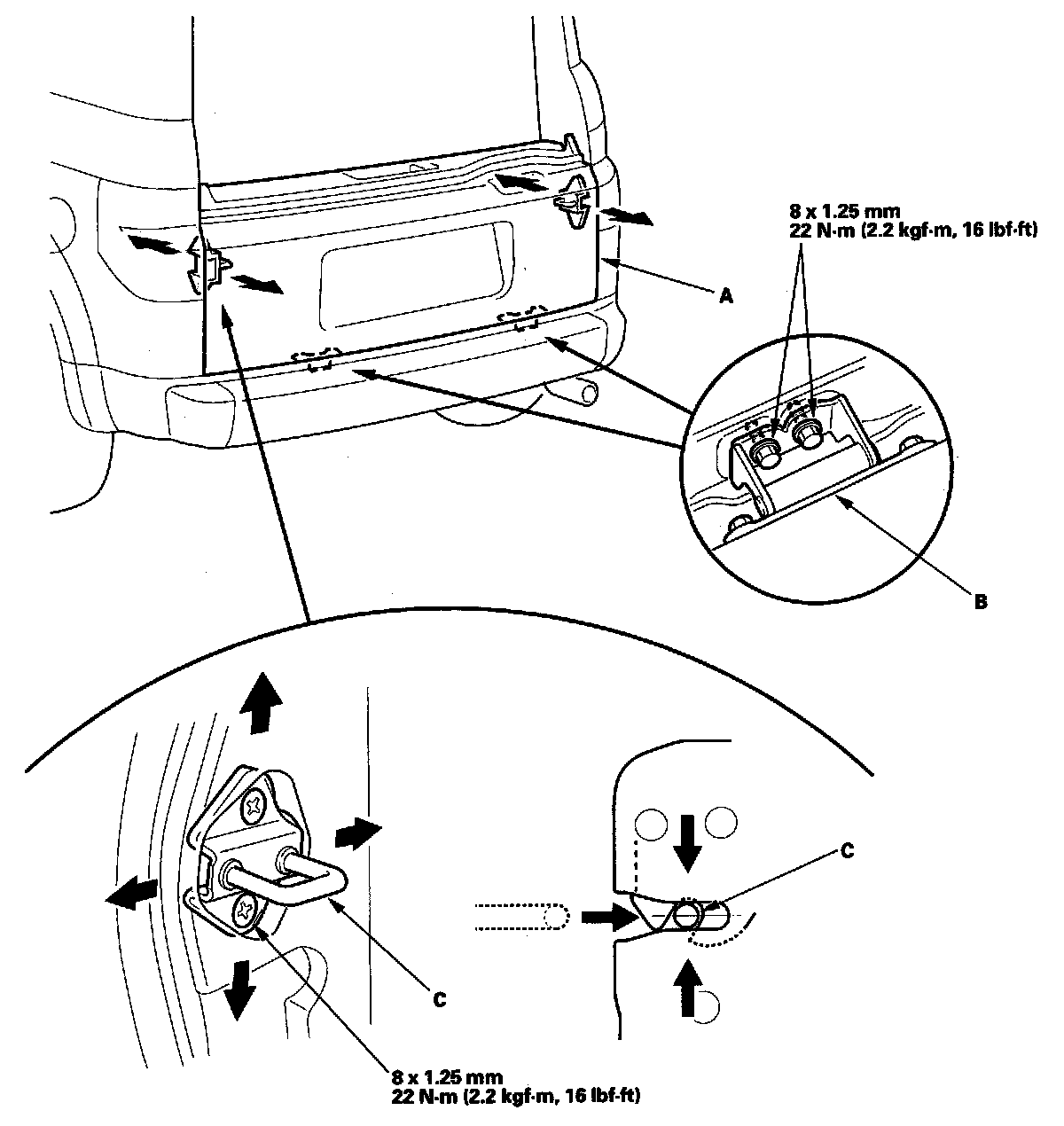 - Adjust the fit between the tailgate and tailgate opening by moving both strikers (C).