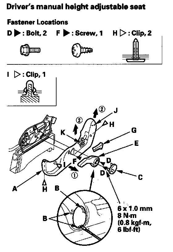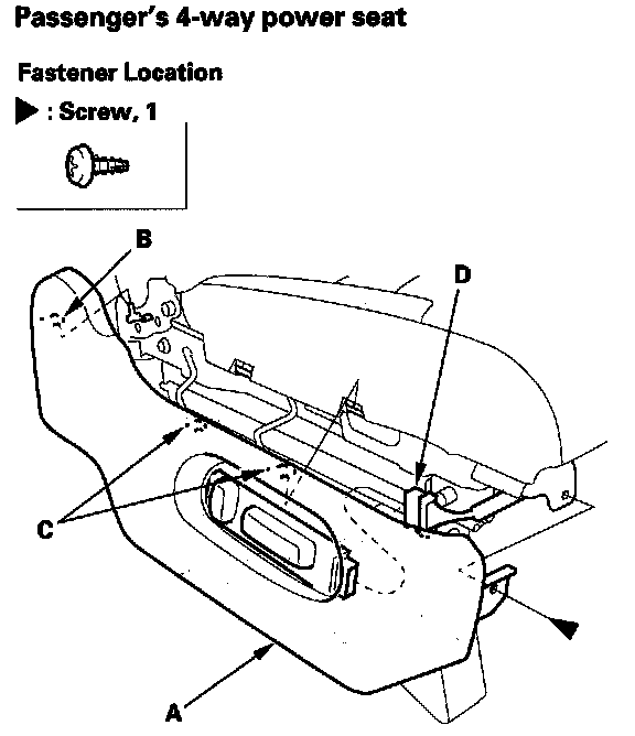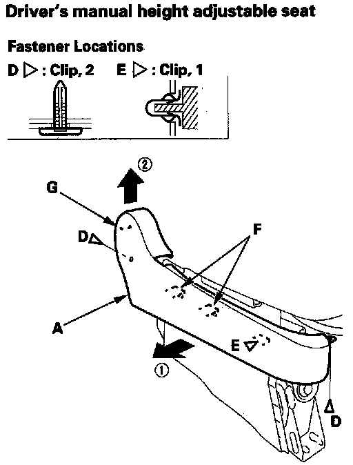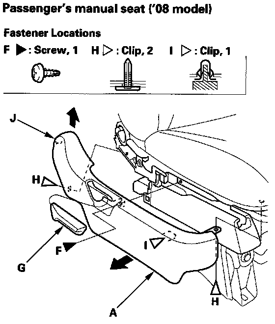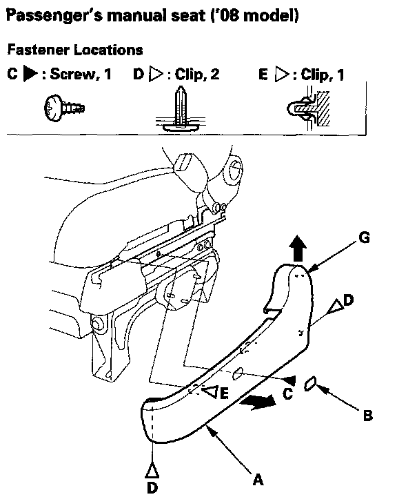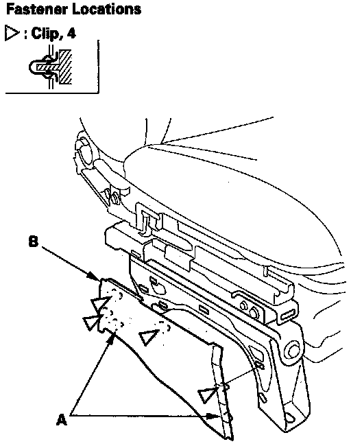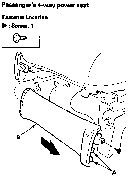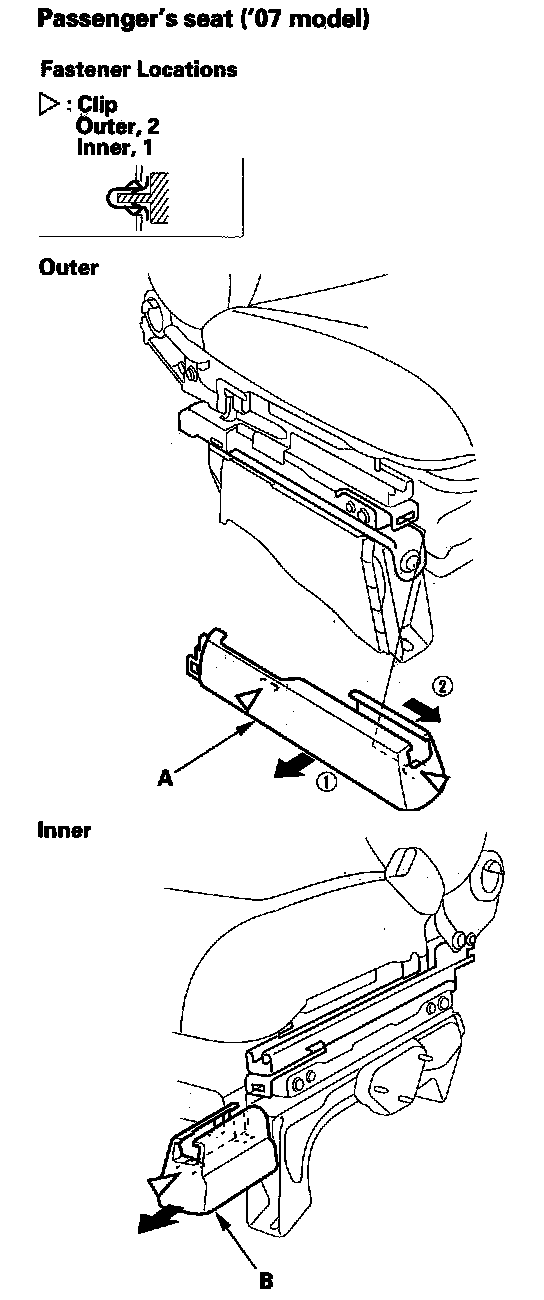 11. '07 model passenger's manual seat: Detach the rod fastener (A), then remove the recline rod (B).