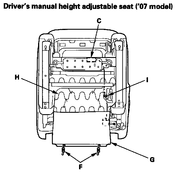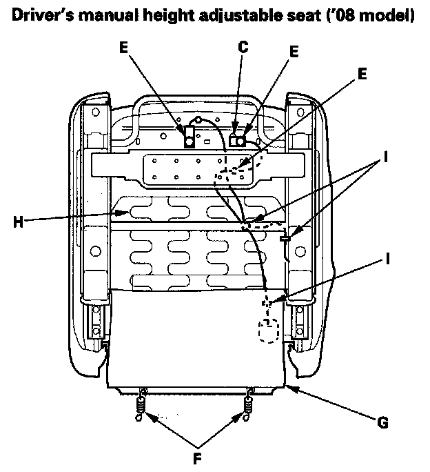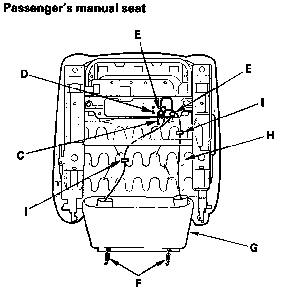 13. From under the seat cushion, disconnect the recline motor subharness connector (A), and if equipped, the seat-back heater connector (B) on the driver's 8-way power seat. Disconnect the side airbag connector (C), the OPDS/ODS unit connector (D) on the passenger's seat, and detach harness clips (E). Release the hook springs (F) and seat cushion cover (G) from the seat cushion frame spring (H), then pull the cover back, and release the wire ties (I).