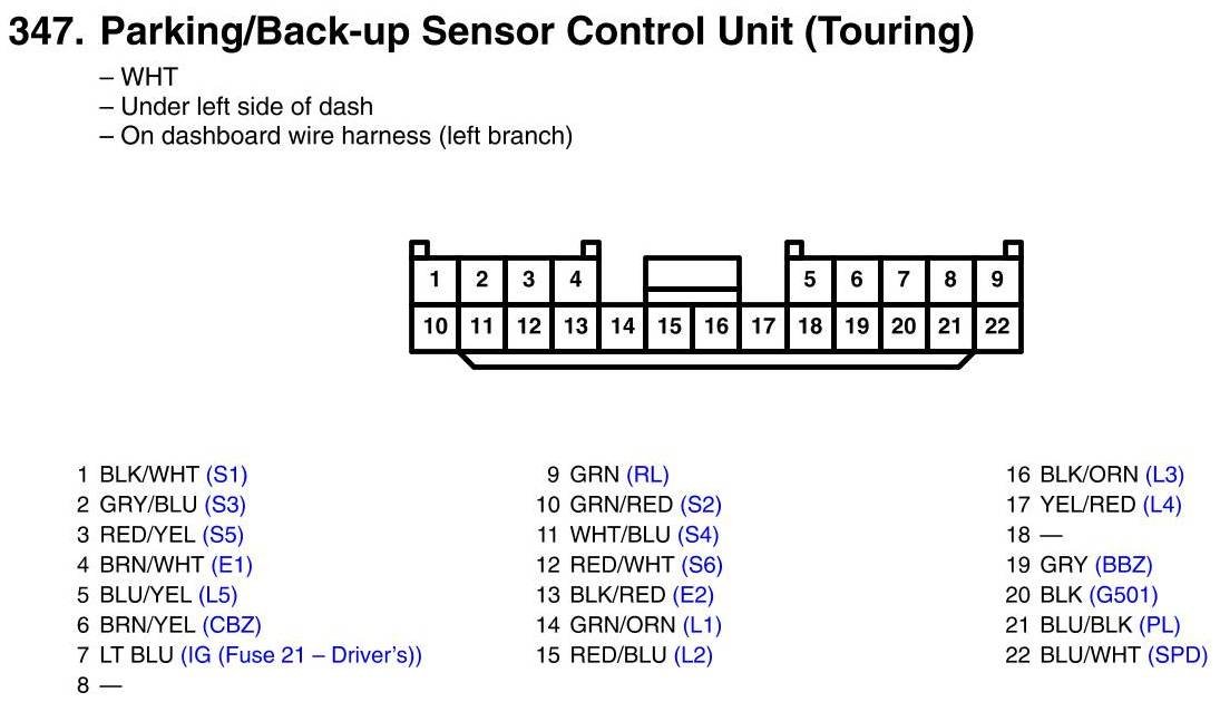 Parking/Back-up Sensor Control Unit Connector View (Touring)