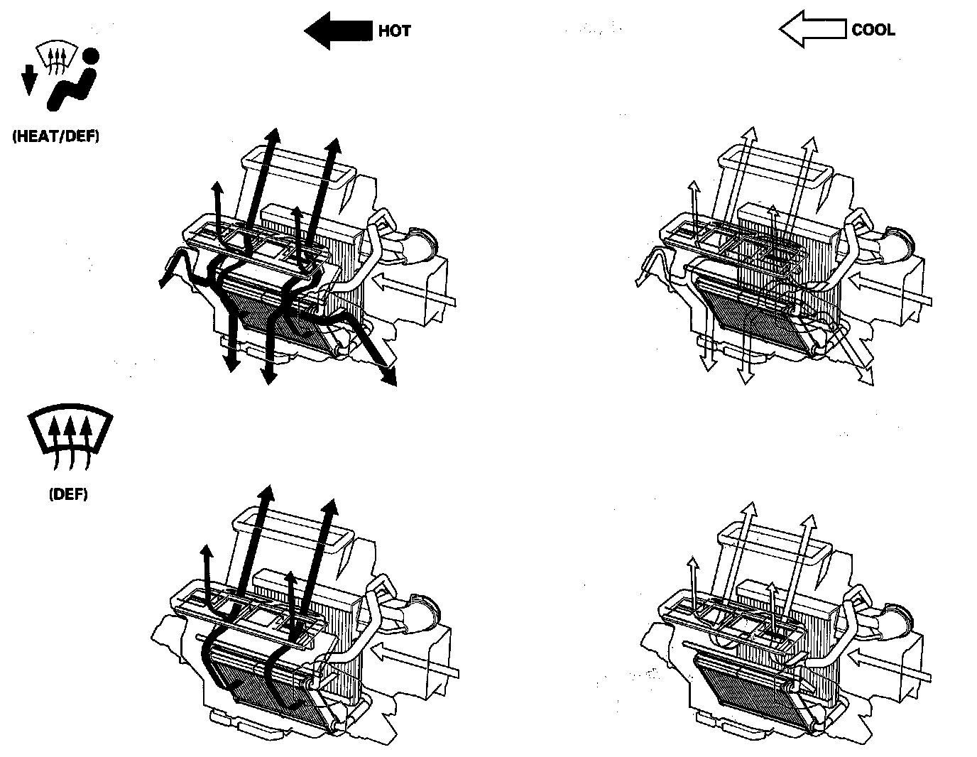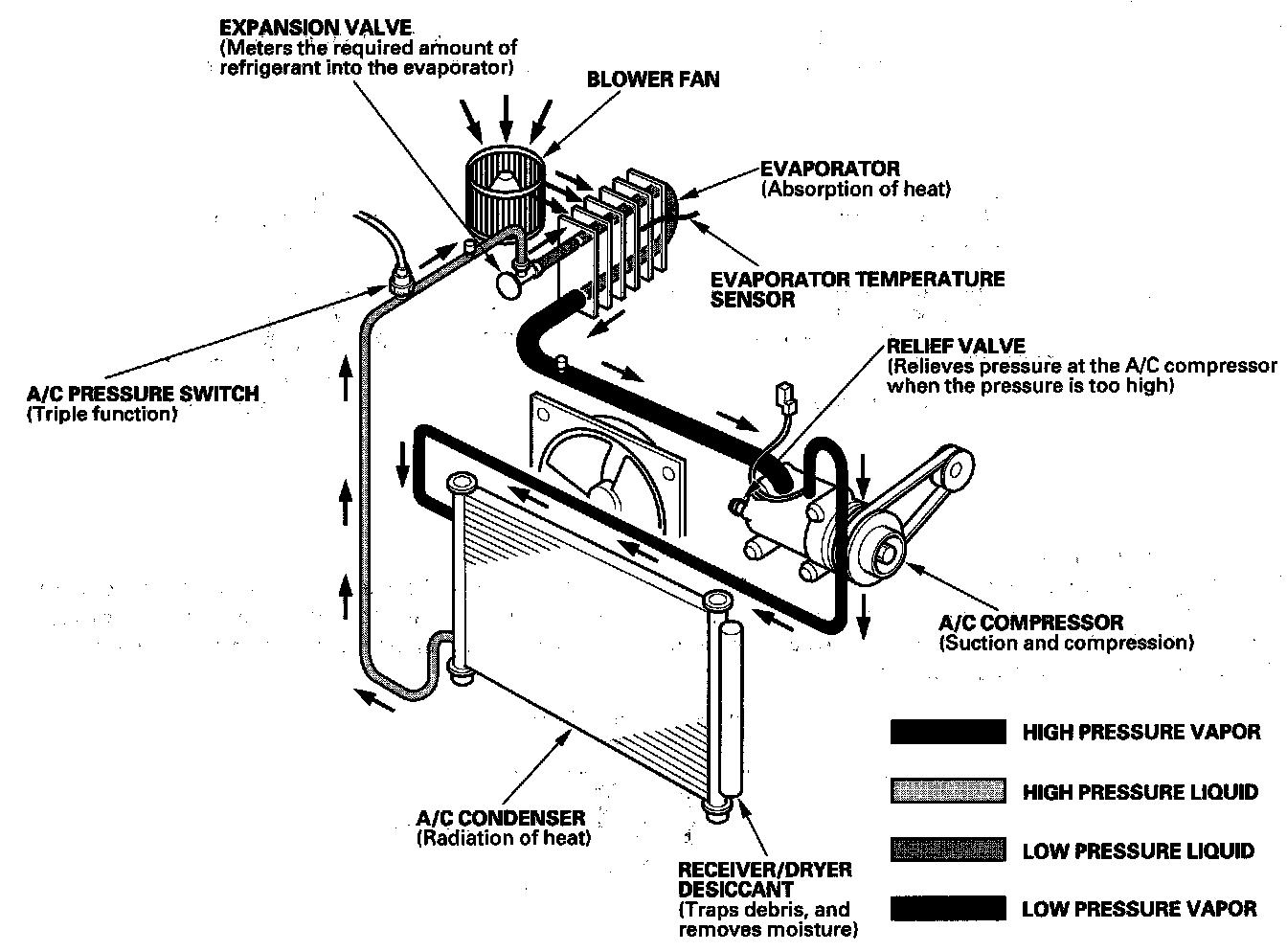 System DescriptionThe air conditioning system removes heat from the passenger compartment by transferring heat from the ambient air to the evaporator. The evaporator cools the air with the refrigerant that is circulating through the evaporator. The refrigerant expands in the evaporator, and the evaporator becomes very cold and absorbs the heat from the ambient air. The blower fan pushes air across the evaporator where the heat is absorbed, and then it blows the cool air into the passenger compartment.