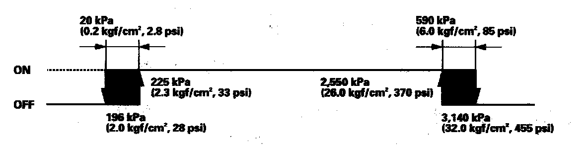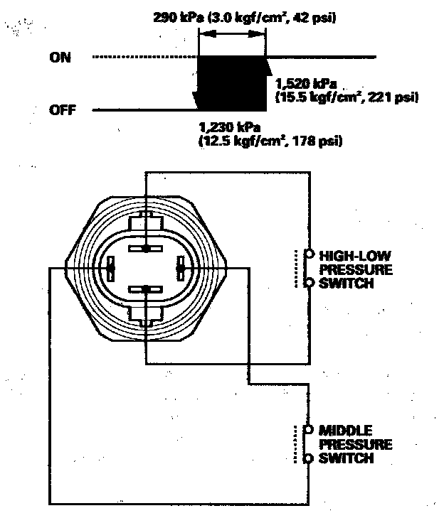 If the refrigerant pressure goes above 1,520 kPa (15.5 kgf/sq.cm, 221 psi), the A/C pressure switch closes to signal the PCM to change the speed of the A/C condenser fan and radiator fan to high. When the refrigerant pressure drops below 1,230 kPa (12.5 kgf/sq.cm, 178 psi), the A/C pressure switch opens to signal the PCM to change the speed of the A/C condenser fan and radiator fan to low.
