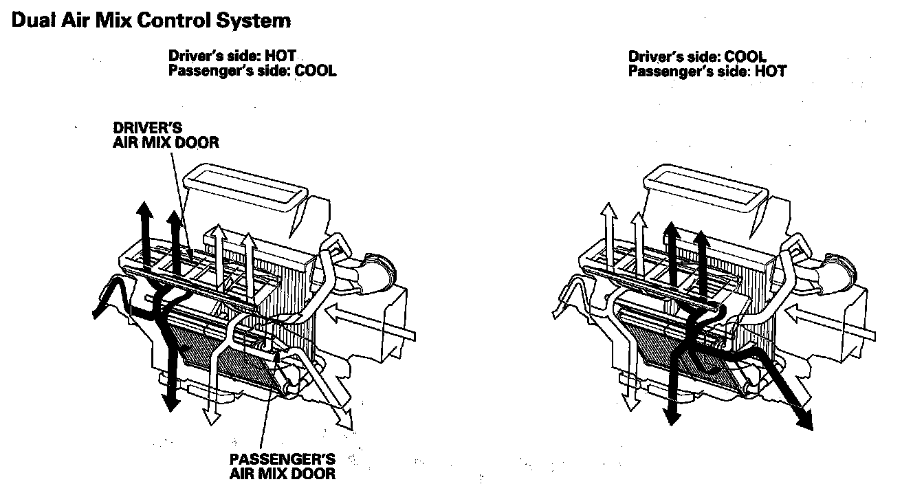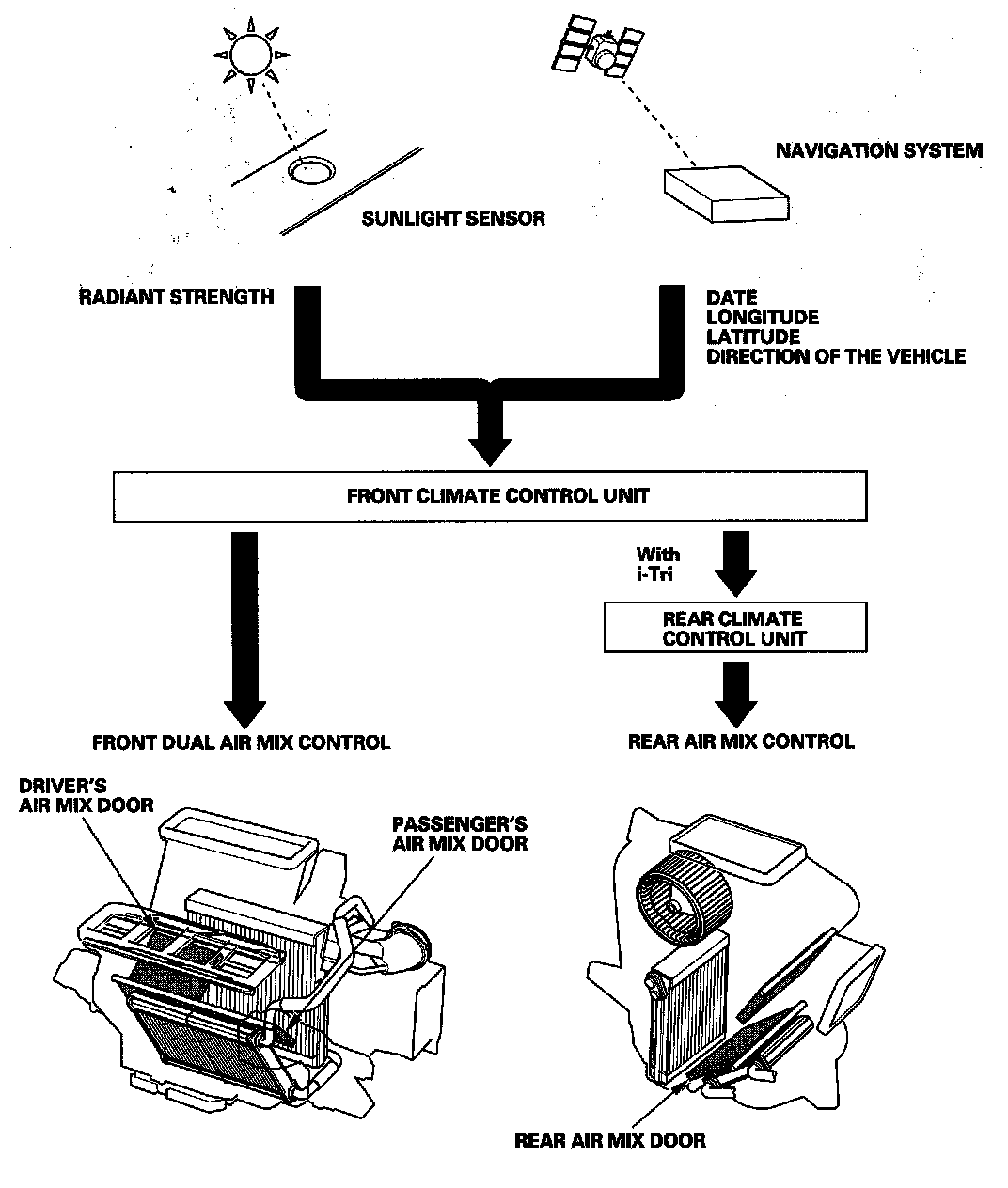 The "i-Dual" climate control system automatically controls the temperature and the vent mode of the air direction to the driver's and passenger's side, depending on the angle of the sun, and the direction of the vehicle. It calculates information such as date, time, longitude, and latitude from the navigation system, as well as the radiant strength of the sun from the sunlight sensor, to determine the appropriate mode position and temperature to be directed to each side. The "i-Tri" climate control system is an addition of the automatic controls with the temperature and the vent mode of the air direction to the rear section to the "i-Dual" climate control system.