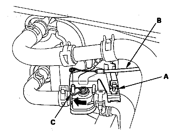 4. From under the hood, open the cable clamp (A), then disconnect the heater valve cable (B) from the heater valve arm (C). Turn the heater valve arm to the fully opened position as shown.