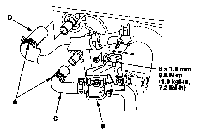 6. Slide the hose clamps (A) back. Remove the nut and the water valve (B), then disconnect the inlet heater hose (C) and the outlet heater hose (D) from the heater unit. Engine coolant will run out when the hoses are disconnected; drain it into a clean drip pan. Be sure not to let coolant spill on the electrical parts or the painted surfaces. If any coolant spills, rinse it off immediately.