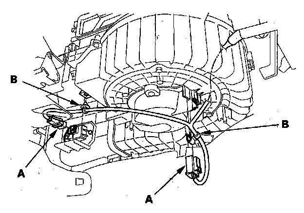 9. Disconnect the connectors (A) from the front blower motor and the front power transistor, then remove the wire harness clips (B).