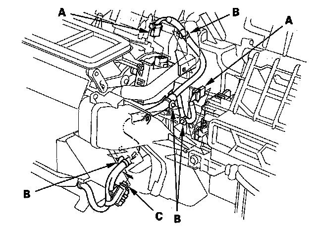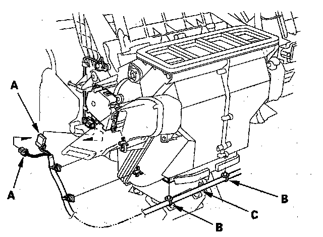 11. Disconnect the connectors (A) from the evaporator sensor and the front air mix control motor, then remove the wire harness clips (B) and the wire harness (C).