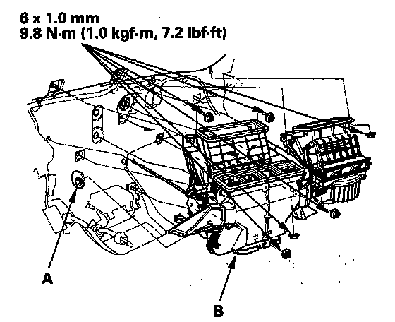 Heater Unit/Core ReplacementSRS components are located in this area. Review the SRS component locations and the precautions and procedures before doing repairs or service.