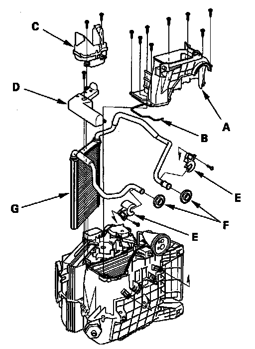13. Remove the self-tapping screws, the joint duct (A), and seal (B). Remove the self-tapping screws, then remove the passenger's heater outlet (C), and the heater core cover (D). Remove the self-tapping screws, the heater pipe brackets (E), the grommets (F), and carefully pull out the heater core (G) so you don't bend the inlet and outlet pipes.