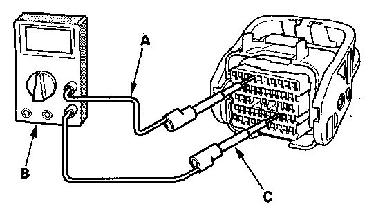 6. Connect one side of the patch cord (A) terminals to a commercially available digital multimeter (B), and connect the other side of the patch cord terminals to a commercially available banana jack (Pomona Electronics Tool No. 3563 or equivalent) (C).