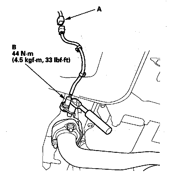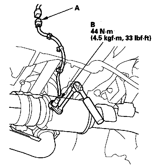 1. Disconnect the rear secondary HO2S4P connector (A), then remove the rear secondary HO2S (B).