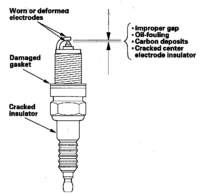 Spark Plug Inspection1. Remove the spark plugs, then inspect the electrodes and the ceramic insulator.