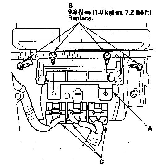 1. Install the SRS unit (A) with new TORX bolts (B), then connect the connectors (C) to the SRS unit; push them into position until they click.