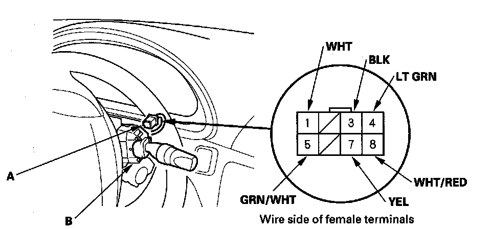 3. Remove the self-tapping screws, then disconnect the 8P connector (A) from the wiper/washer switch (B).