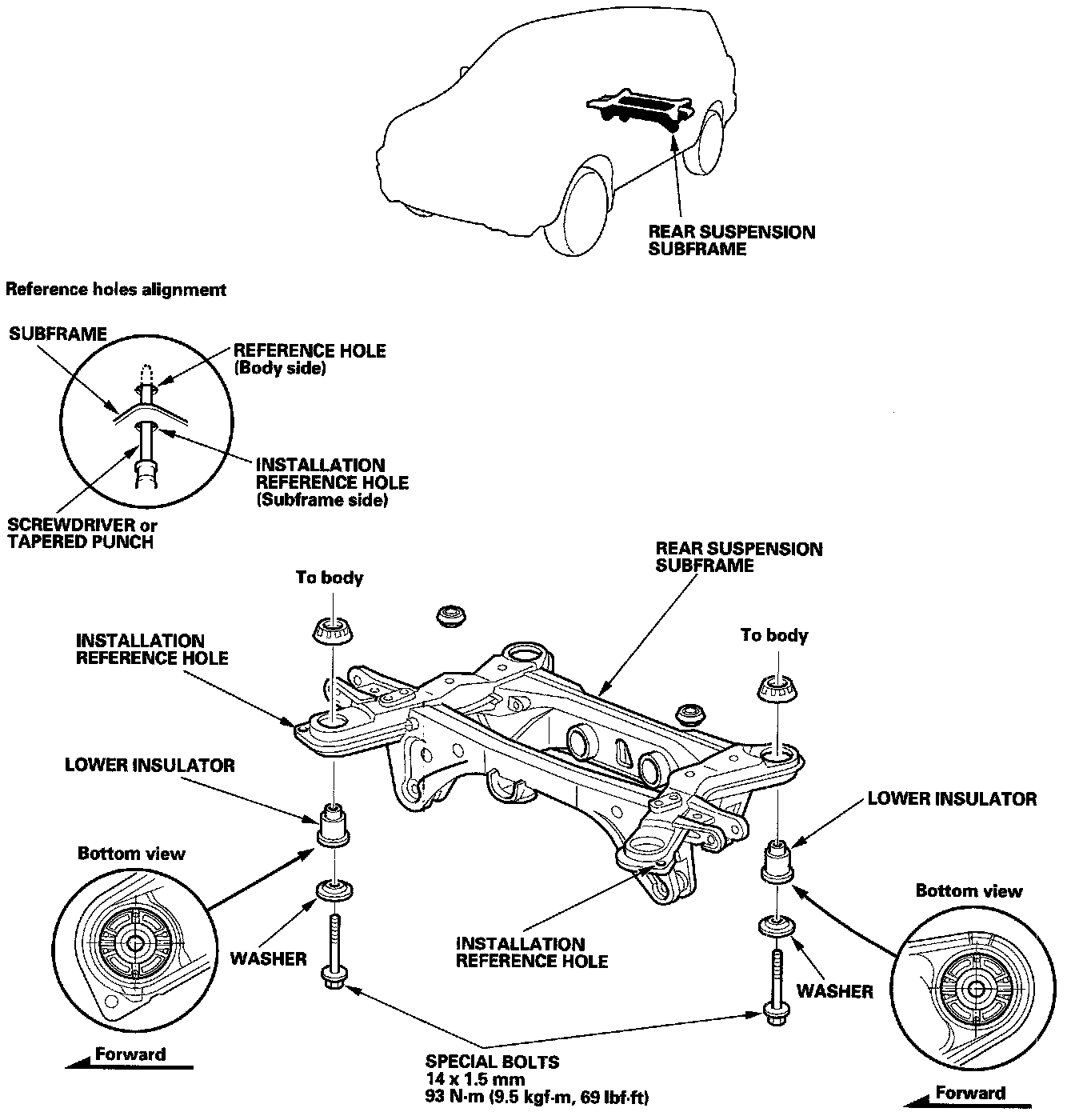 After removing the subframe mounting bolts, be sure to replace them with new ones.