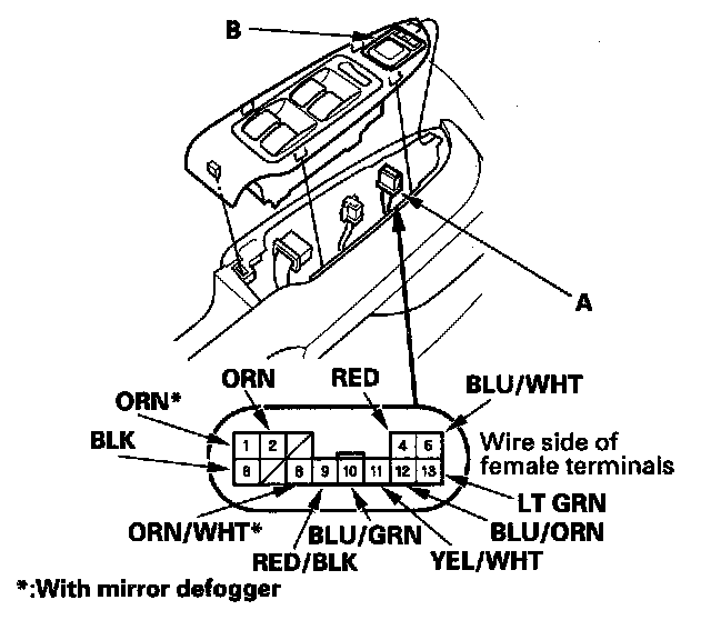 2. Disconnect the 13P connector (A) from the power mirror switch (B), and inspect the terminals. If OK, go to step 3.