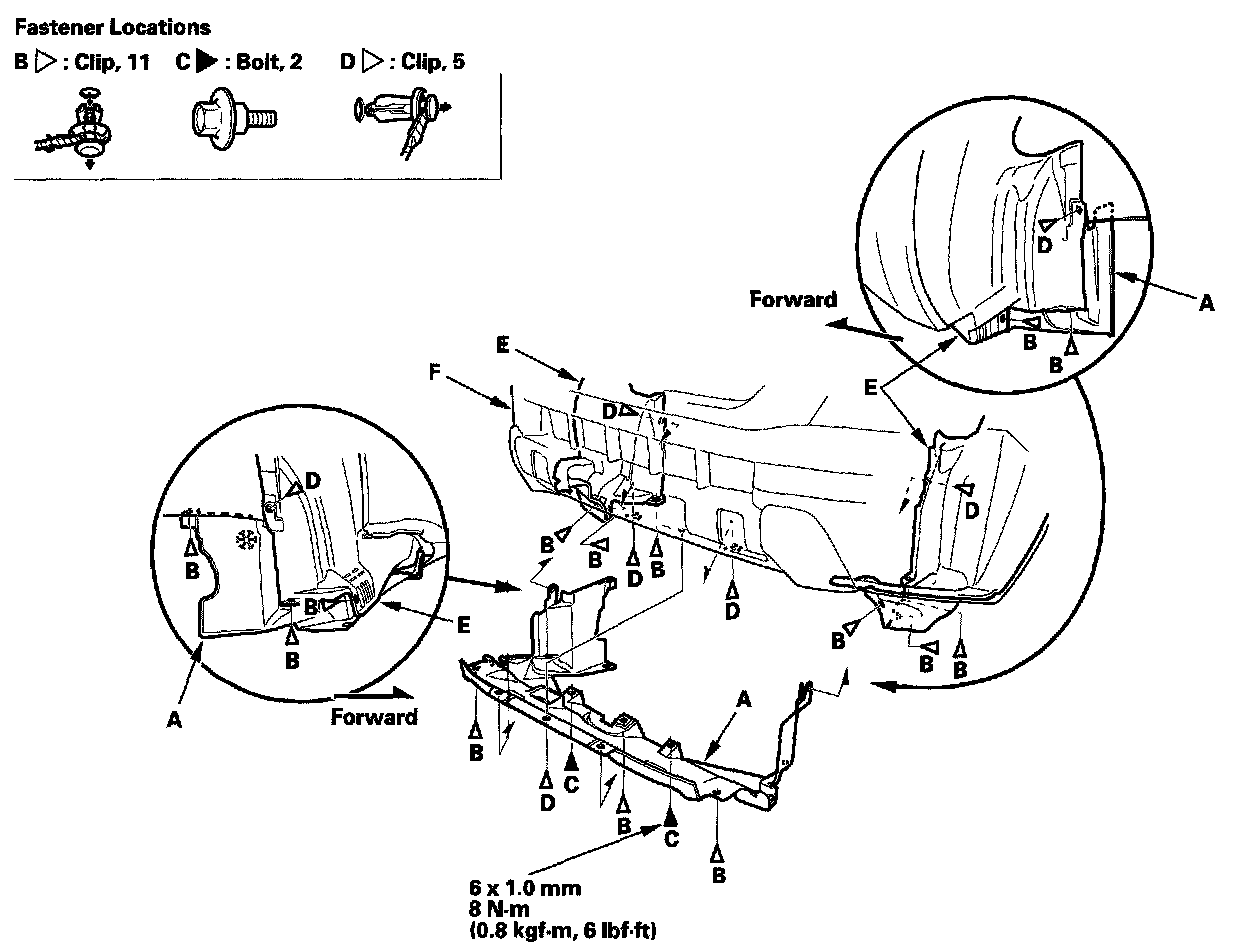3. From under the front bumper (F), remove the clips (B, D).