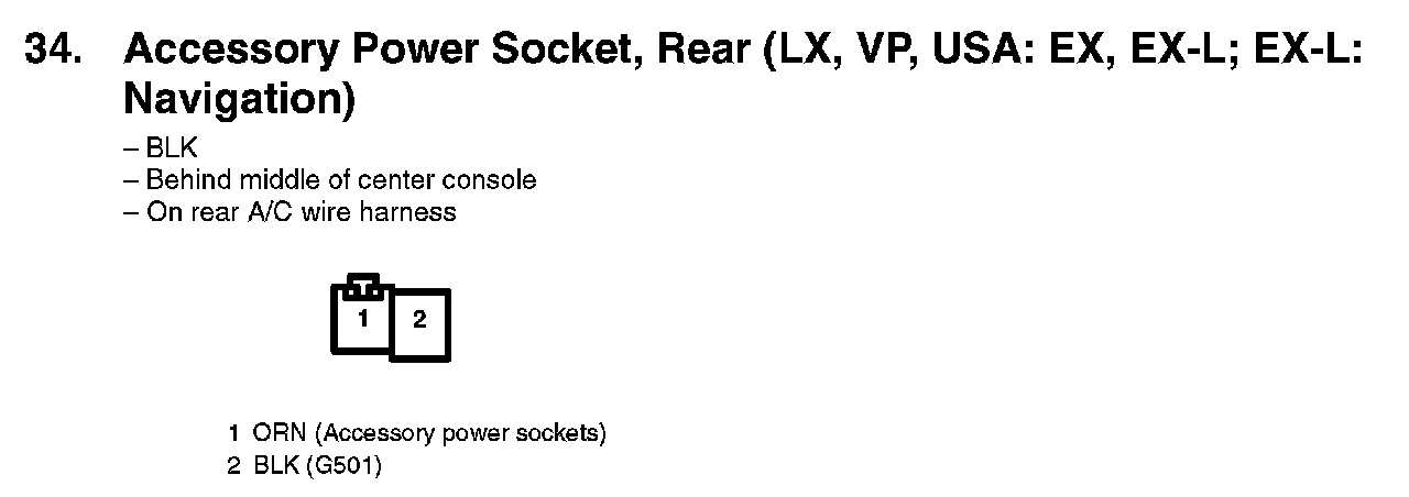 34. Accessory Power Socket, Rear (LX, VP, USA: EX, EX-L; EX-L: Navigation):