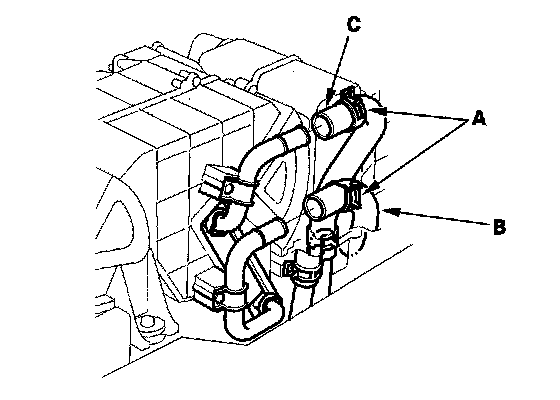 4. Slide the hose clamps (A) back, then disconnect the inlet heater hose (B) and the outlet heater hose (C) from the rear heater core. Engine coolant will run out when the hoses are disconnected; drain it into a clean drip pan. Be sure not to let coolant spill on the electrical parts or the painted surfaces. If any coolant spills, rinse it off immediately.