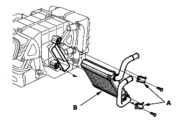 5. Remove the self-tapping screws and the clamps (A). Carefully pull out the rear heater core (B) so you don't bend the inlet and outlet pipes.