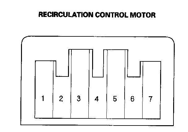 2. Connect battery power to the No. 1 terminal of the recirculation control motor, and ground the No. 5 or No. 7 terminals; the recirculation control motor should run smoothly. To avoid damaging the recirculation control motor, do not reverse power and ground. Disconnect the No. 5 or No. 7 terminals from ground; the recirculation control motor should stop at Fresh (when the No. 7 terminal is disconnected) or Recirculate (when the No. 5 terminal is disconnected). Don't cycle the recirculation control motor for a long time.