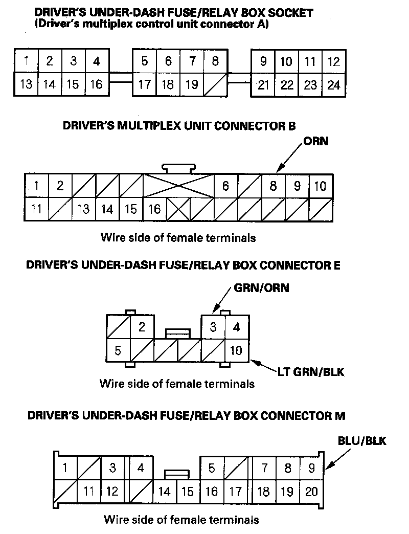 5. Reconnect the driver's multiplex control unit to the driver's under-dash fuse/relay box, and perform the following input tests at the appropriate connectors on the back of the driver's under-dash fuse/relay box. For driver's under-dash fuse/relay box connector socket location.