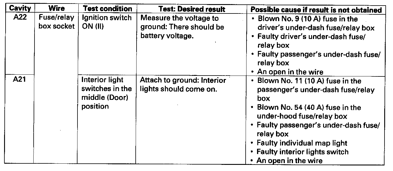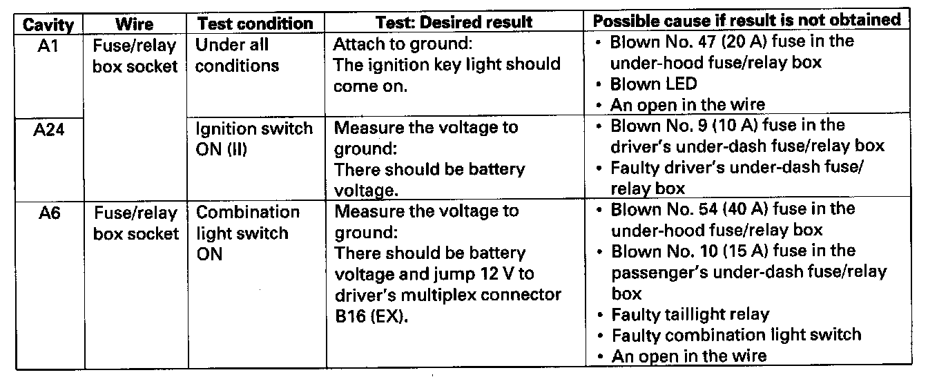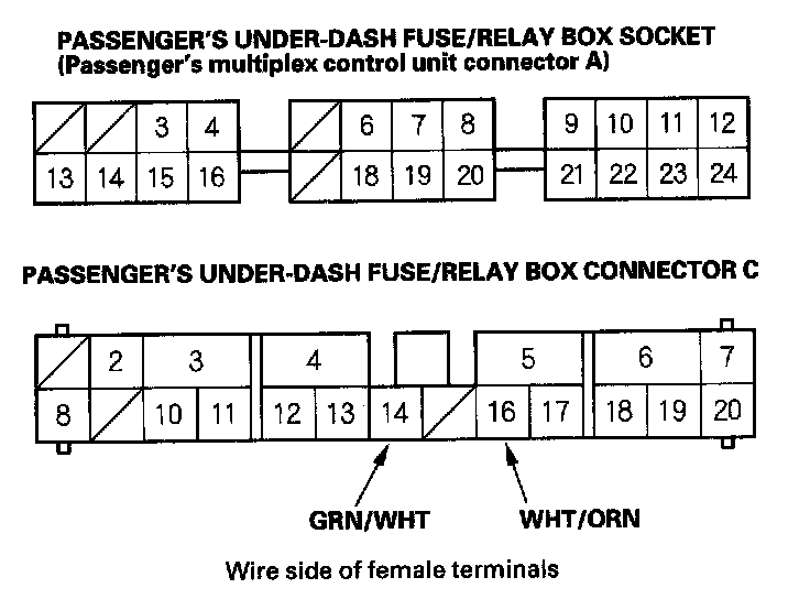 8. With the passenger's multiplex control unit still disconnected, make these input tests at the connector and passenger's under-dash fuse/relay box socket.