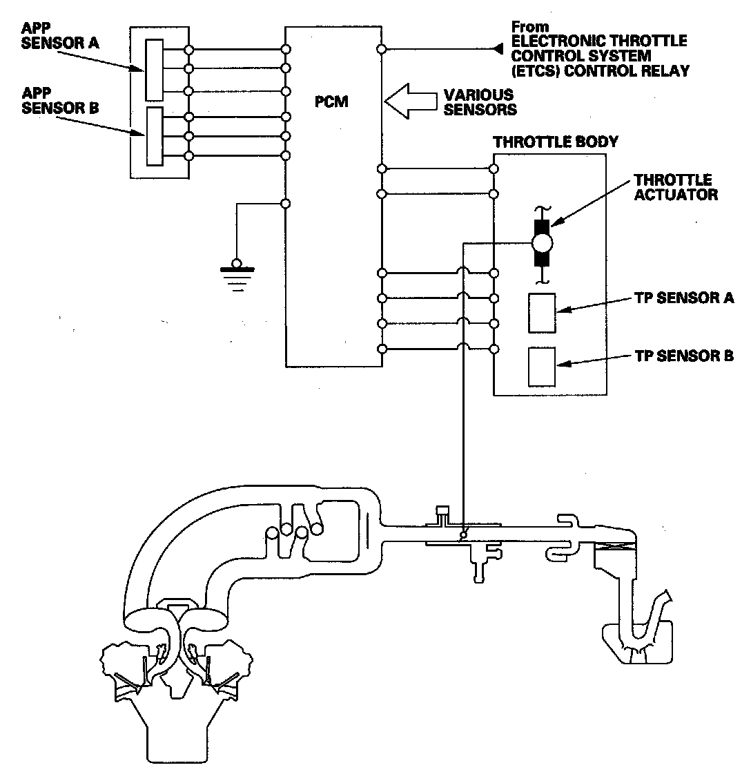 Electronic Throttle Control System DiagramThe electronic throttle control system consists of the throttle actuator, throttle position (TP) sensor A/B, accelerator pedal position (APP) sensor A/B, the electronic throttle control system (ETCS) control relay, and the PCM.