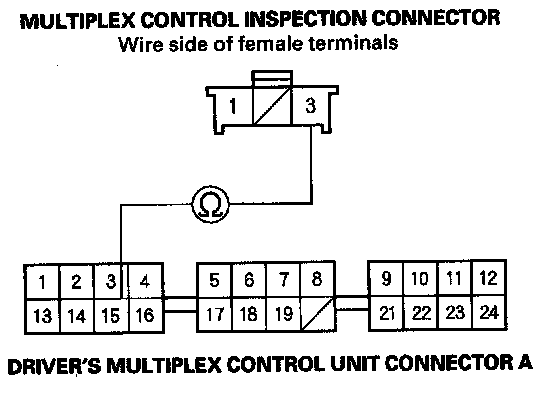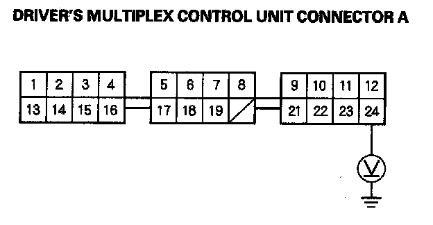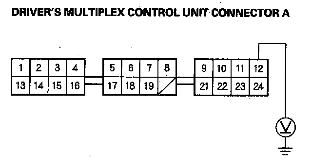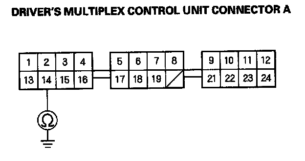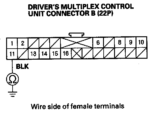12. Check for continuity between the B11 terminal of the driver's multiplex control unit connector and body ground.