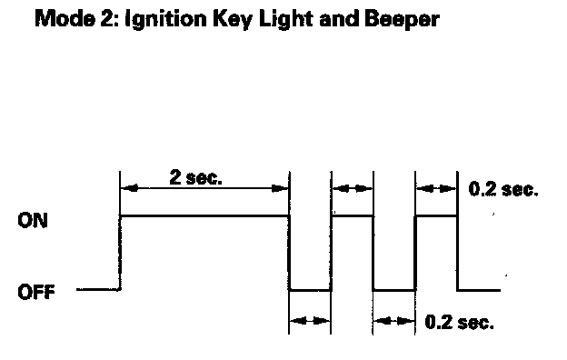 4. After about 5 seconds, the ignition key light should come on and the beeper should beep for 2 seconds, go off for 0.2 seconds, then blink and beep for 0.2 second. This means that you are in Mode 1 of the self-diagnosis function. Check self-diagnostic function Mode 1 for a diagnostic trouble code (DTC).