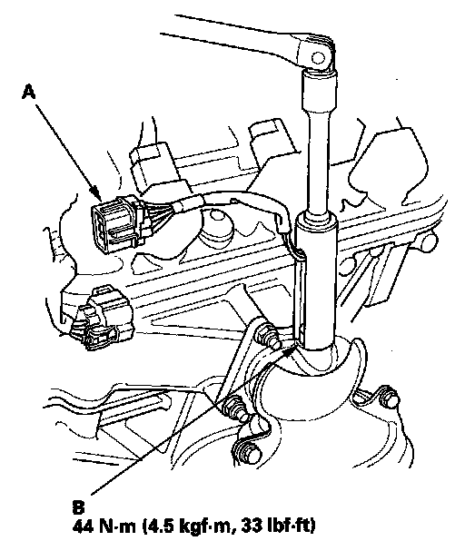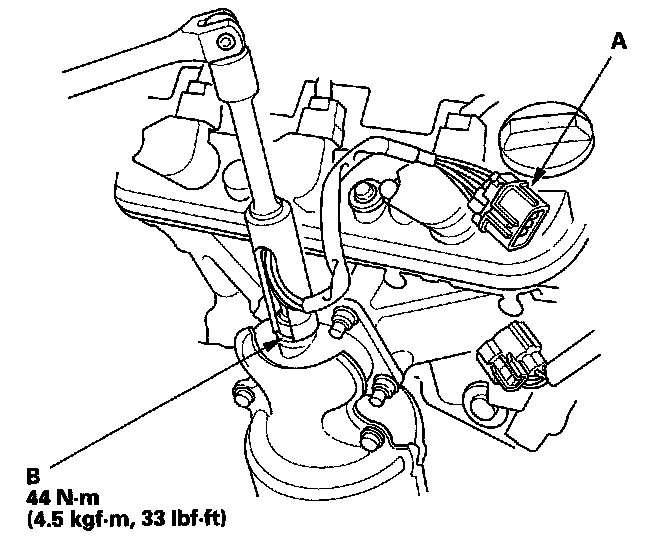 2. Disconnect the rear A/F sensor 8P connector (A), then remove the rear A/F sensor (B).