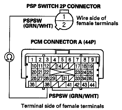 22. Check for continuity between PCM connector terminal A38 and PSP switch 2P connector terminal No. 1.