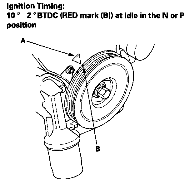 6. Aim the light toward the pointer (A) on the timing belt cover. Check the ignition timing under a no load condition, (headlights, blower fan, rear window defogger, and air conditioner are turned off)