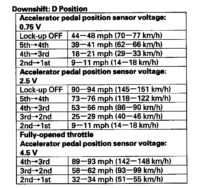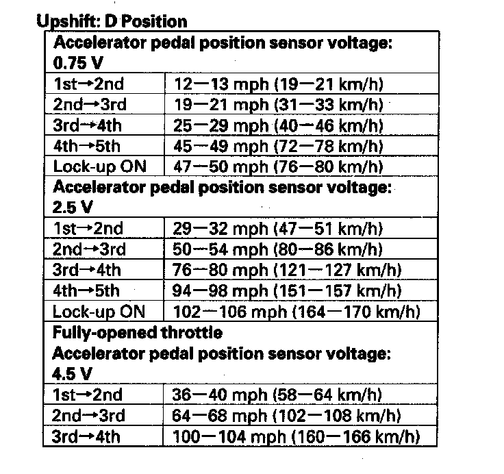 5. Test-drive the vehicle on a flat road in the D position. Check for abnormal noise and clutch slippage. While driving, check that the shift points occur at the proper speeds by monitoring the accelerator pedal position sensor voltage with the HDS and comparing your shift point speeds and voltage to those in the table. (The accelerator pedal position sensor voltage represents the throttle opening.)