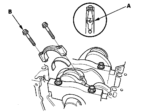 Apply new engine oil to the bolt threads and flanges. Torque the bolts (B) to 20 Nm (2.0 kgf-m, 14 ft. lbs.).