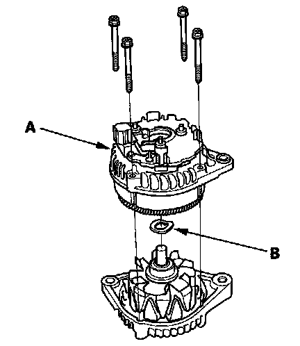 7. Remove the four bolts, then remove the rear housing assembly (A) and washer (B).