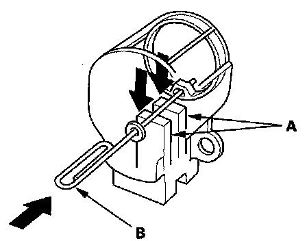19. Push the brushes (A) in, then insert a pin or drill bit (B) (about 1.6 mm (0.06 in.) diameter) to hold them there.