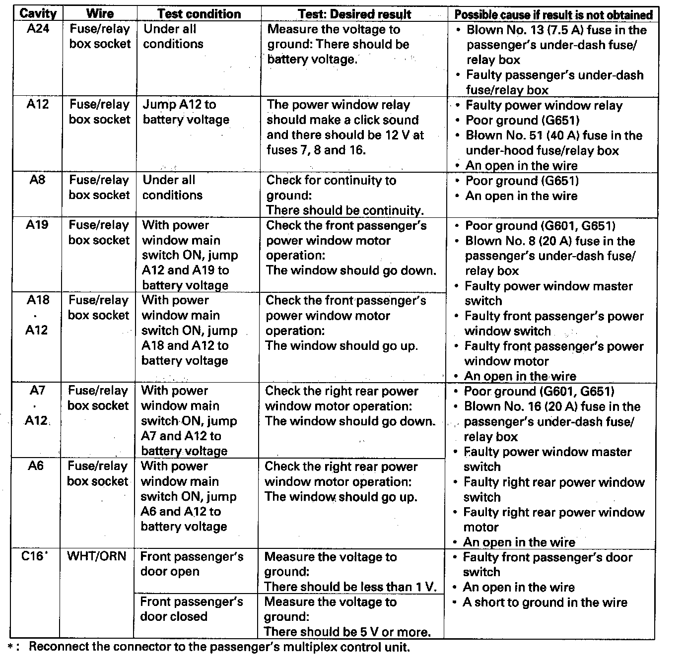 9. Remove the passenger's multiplex control unit from the passenger's under-dash fuse/relay box and connect fuse/relay box socket terminal A12 to battery voltage. This turns the power window relay on.