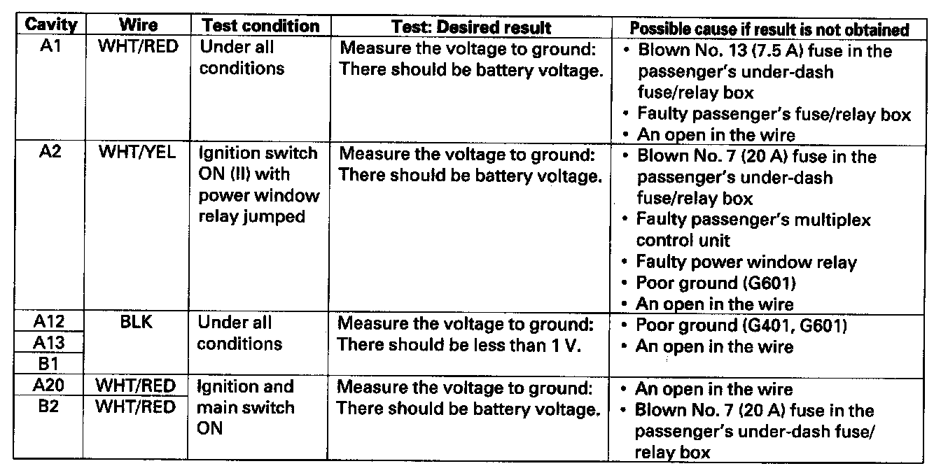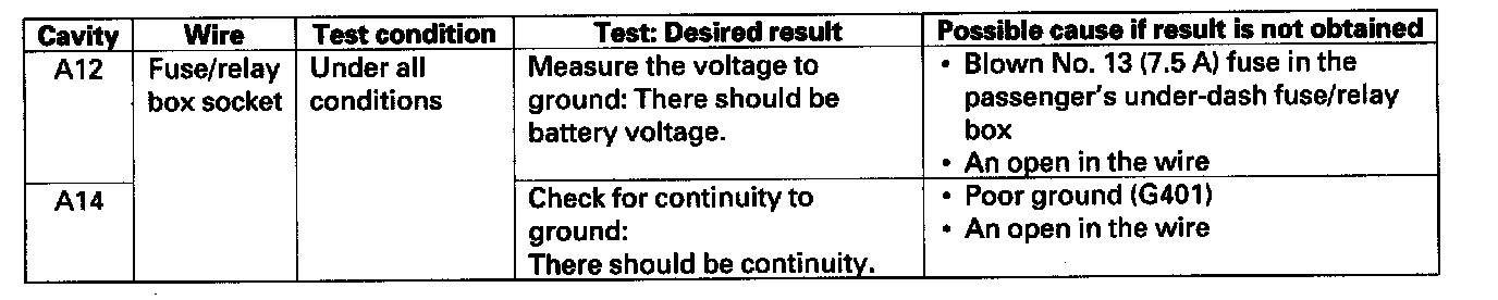4. With the passenger's multiplex control unit still disconnected, make these input tests at the passenger's under-dash fuse/relay box socket.
