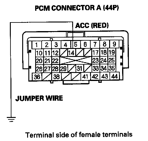 13. Momentarily connect PCM connector terminal A14 to body ground with a jumper wire several times.