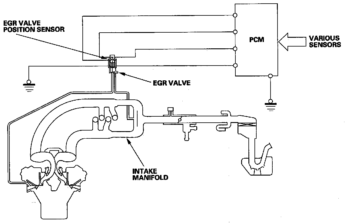 The EGR valve position sensor detects the amount of EGR valve lift, and sends it to the PCM. The PCM then compares it with the ideal lift in its memory (based on signals sent from other sensors). If there is any difference between the two, the PCM cuts current to the EGR valve.