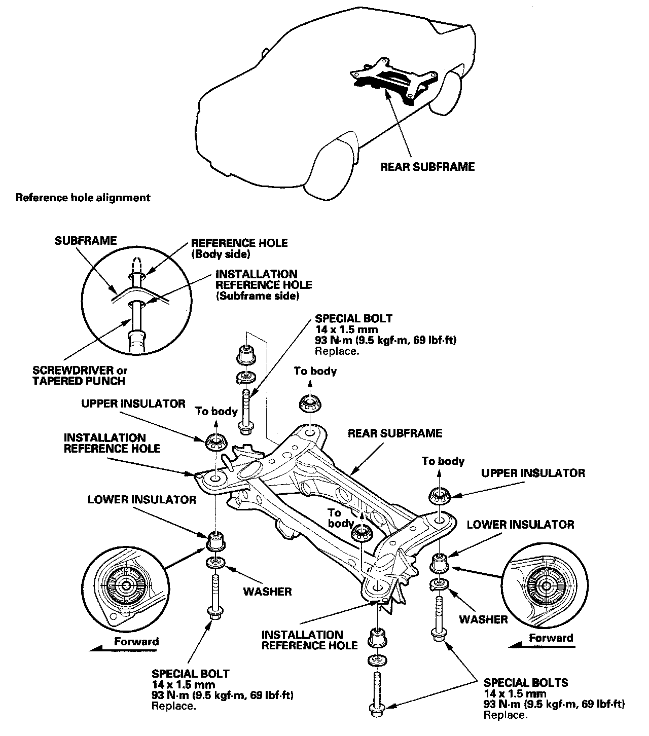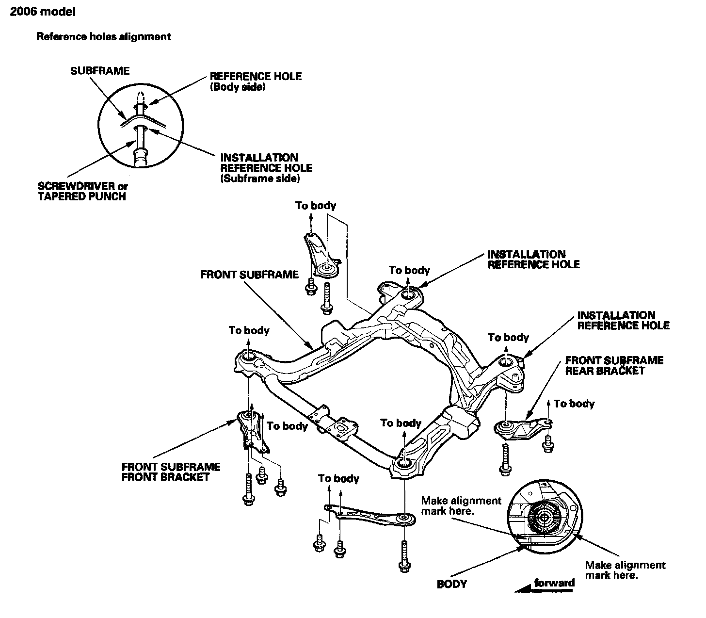 - After mounting the subframe and brackets loosely, align the reference marks with the body, then tighten the bolts.