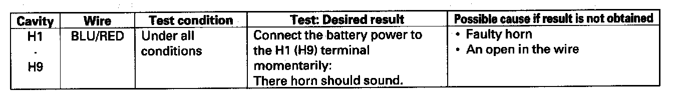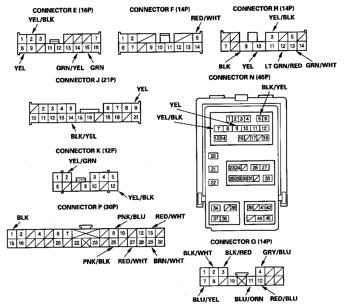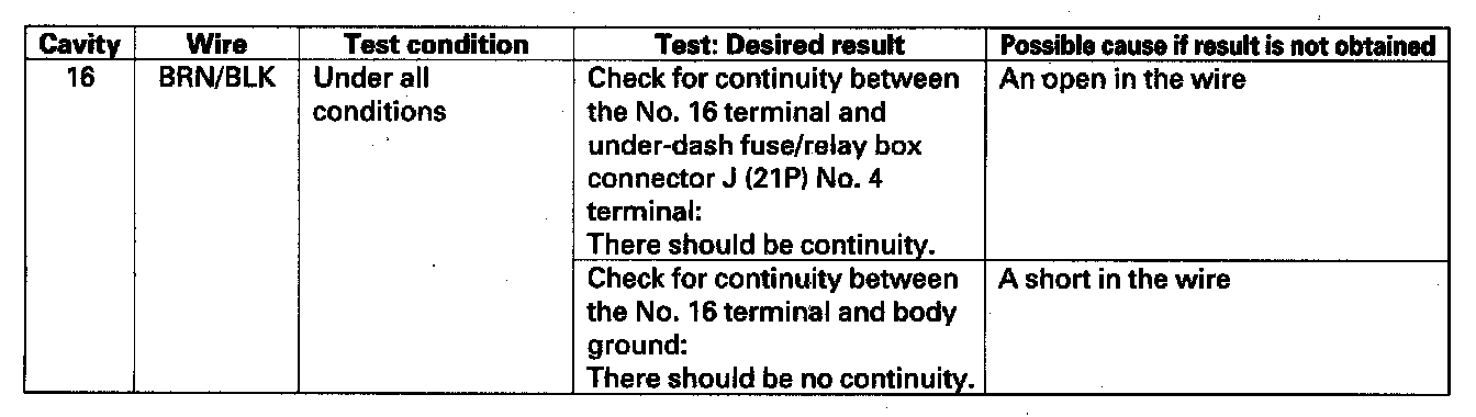 6. Reconnect all connectors to the under-dash fuse/relay box. Turn the ignition switch ON (II), and make these input tests at the appropriate connectors on the under-dash fuse/relay box.