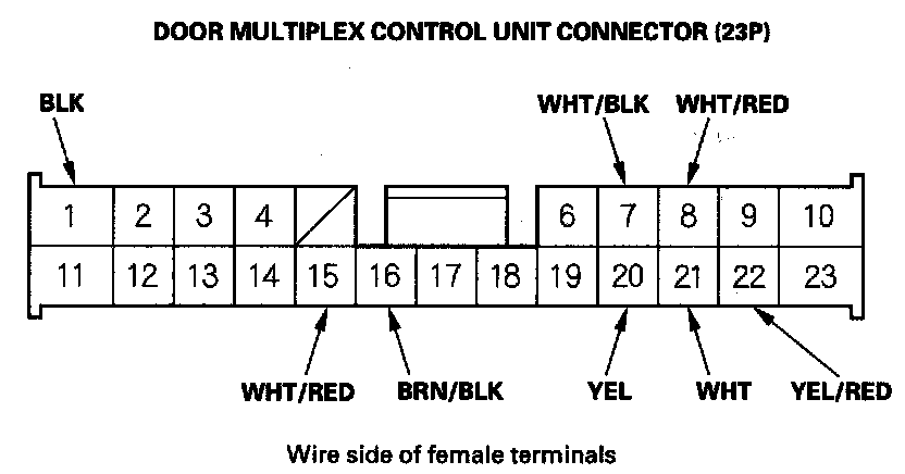 18. Reconnect the connector to the door multiplex control unit. Turn the ignition switch ON (II) and make these input tests at the connectors.