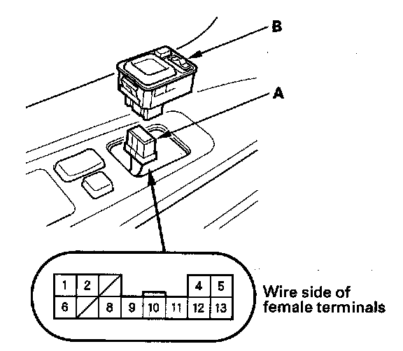 2. Disconnect the 13P connector (A) from the power mirror switch (B), and inspect the terminals. If OK, go to step 3.