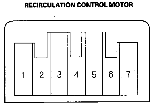 2. Connect battery power to the No. 1 terminal of the recirculation control motor, and ground the No. 5 and No. 7 terminals; the recirculation control motor should run smoothly. To avoid damaging the recirculation control motor, do not reverse power and ground. Disconnect the No. 5 or No. 7 terminals from ground; the recirculation control motor should stop at Fresh (when the No. 7 terminal is disconnected) or Recirculate (when the No. 5 terminal is disconnected). Don't cycle the recirculation control motor for a long time.